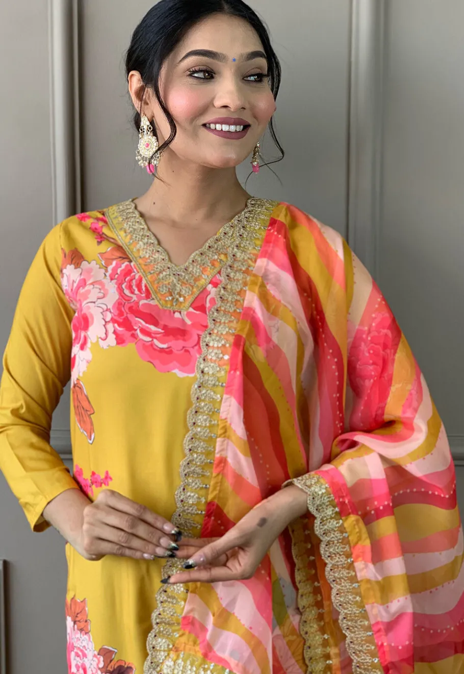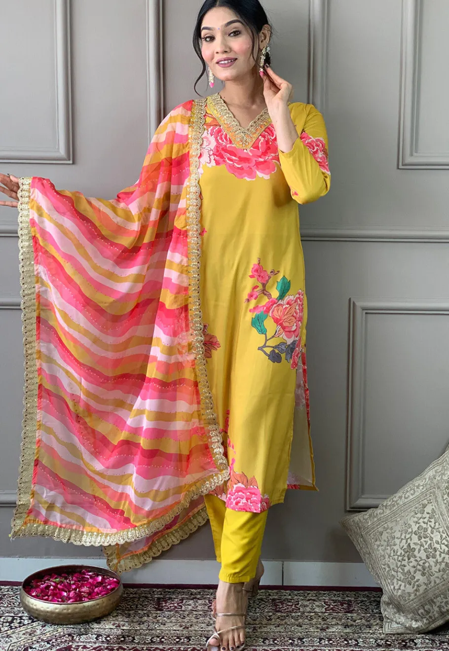 - Available with a Rayon Pant in Yellow and an Organza Dupatta in Pink