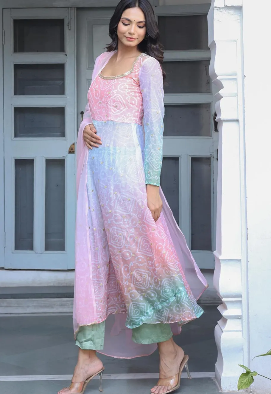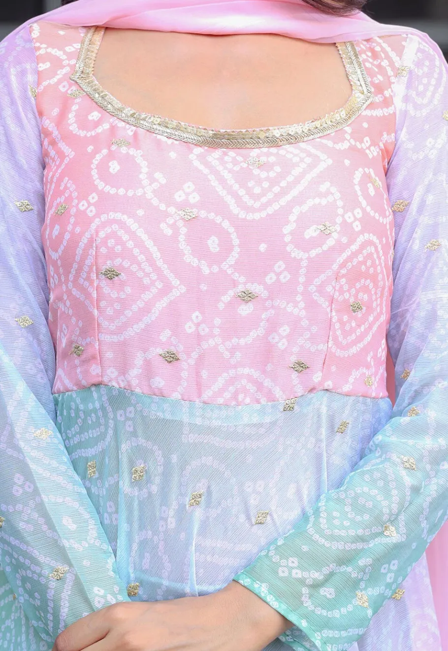 - This attire is Enhanced with Bandhej Print, Zari, Sequins and Lace Border Work. Crafted in Square Neck and Full Sleeve